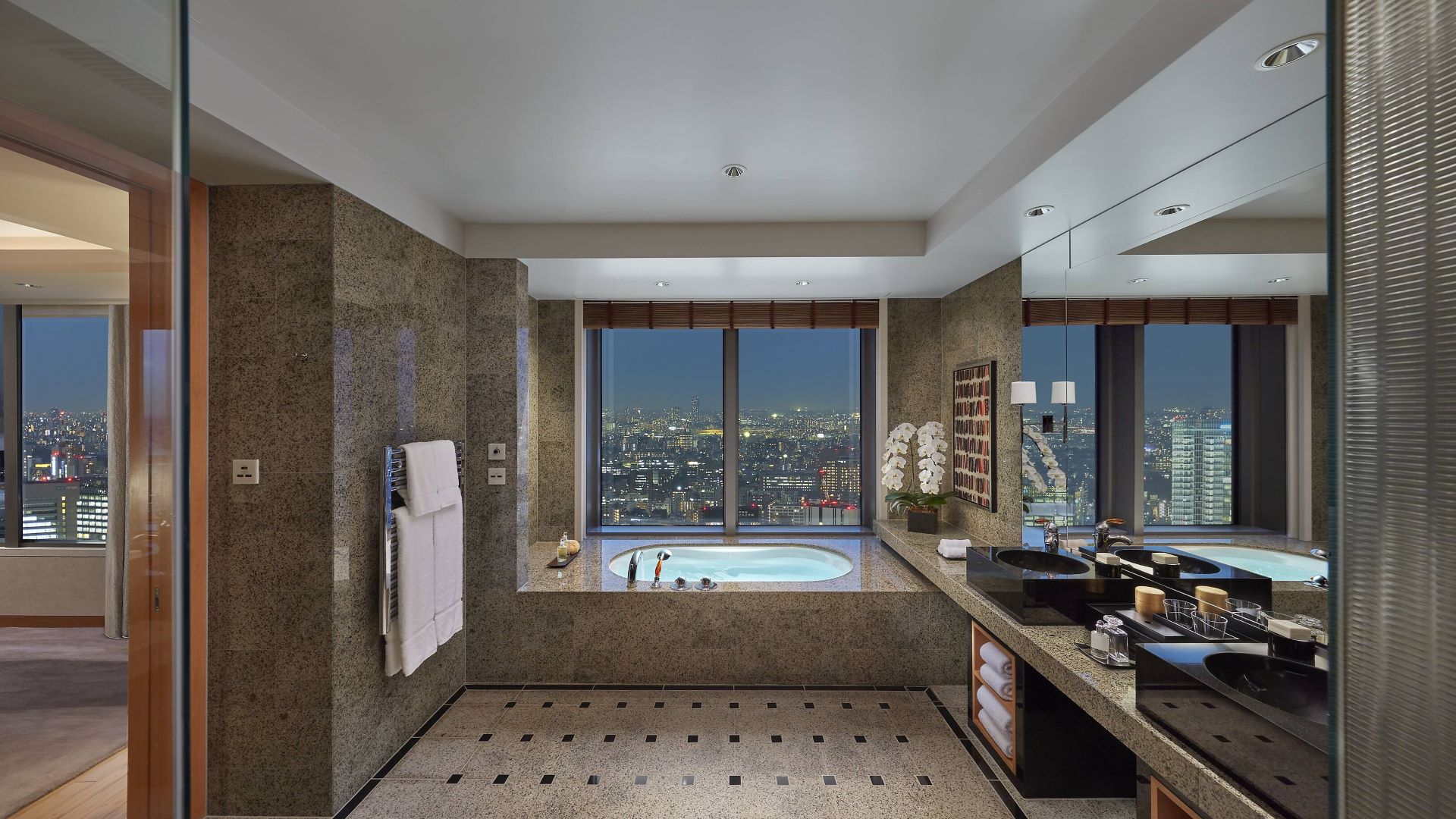 All guests are afforded spectacular sweeping views from floor to ceiling windows from some of the largest rooms in Japan with each room having binoculars to better enjoy the vistas. East facing rooms look out over the Sumida River, Tokyo Bay, Odaiba and Tokyo Skytree while those facing west enjoy views of Ginza, Tokyo Station and the towering skyscrapers of Shinjuku. On clear days, a majestic snow-capped Mount Fuji can be seen in the distance.